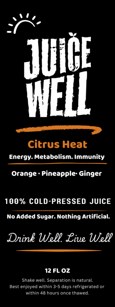 Citrus Heat — Enhanced is a bright and invigorating juice that combines refreshing citrus flavors with a warming kick of natural spices. Orange and pineapple deliver a sweet and tropical base, while ginger and turmeric provide powerful anti-inflammatory support. A touch of cayenne adds gentle heat that helps stimulate circulation and metabolism.
