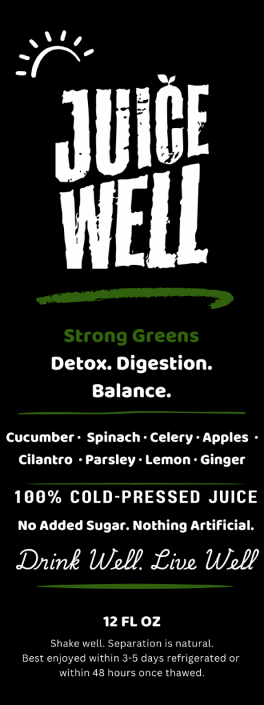 Strong Green is a powerful green juice packed with a wide variety of fresh vegetables and herbs designed to support full-body wellness. Crisp cucumber and celery provide hydration, while spinach and parsley add nutrient density. Apple balances the flavor with natural sweetness, while lemon and ginger brighten the blend.